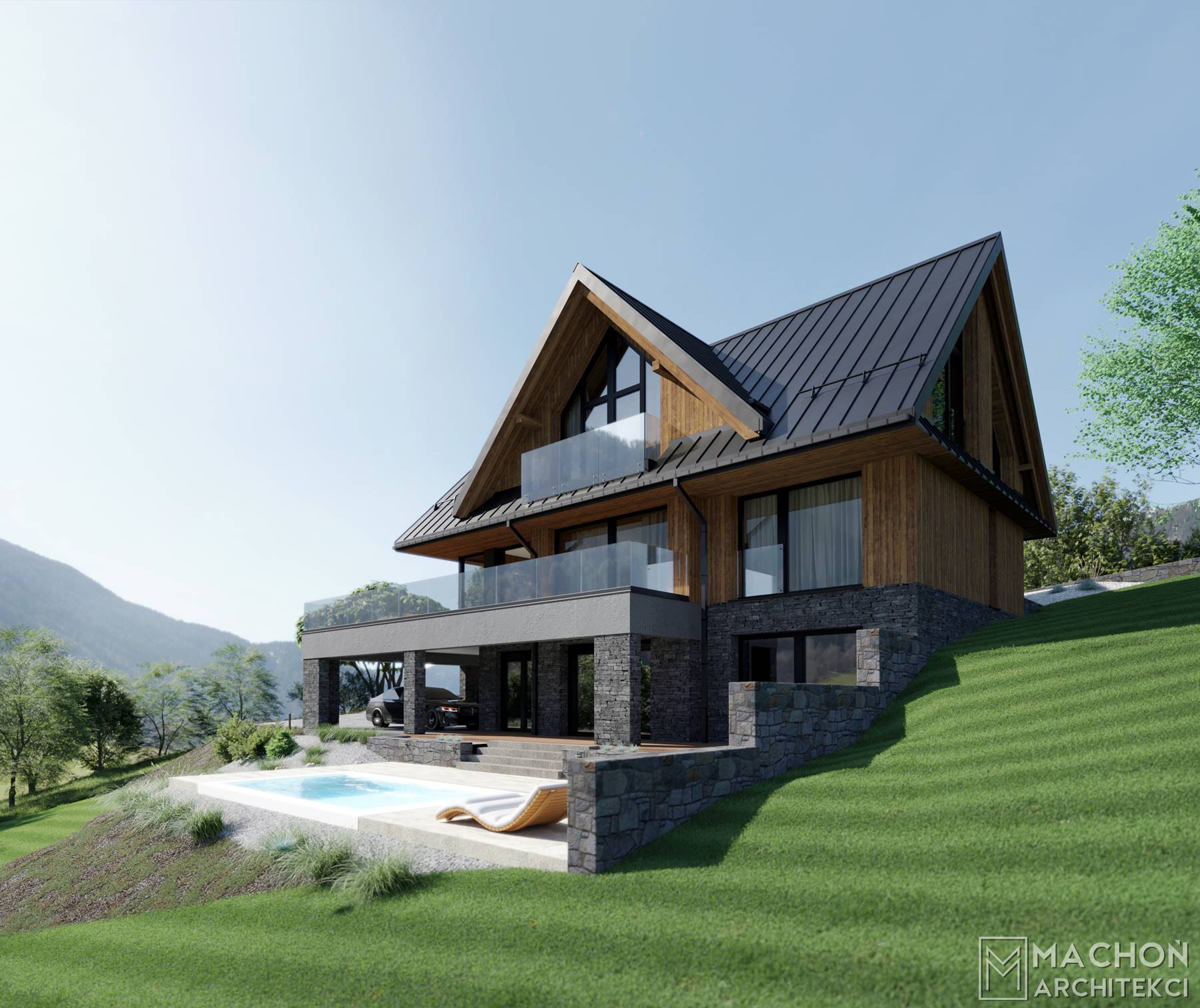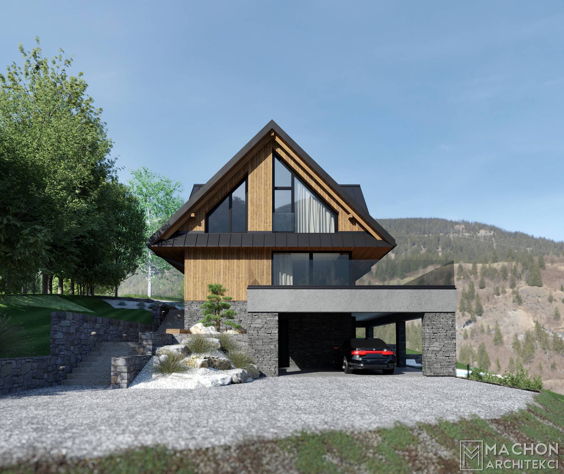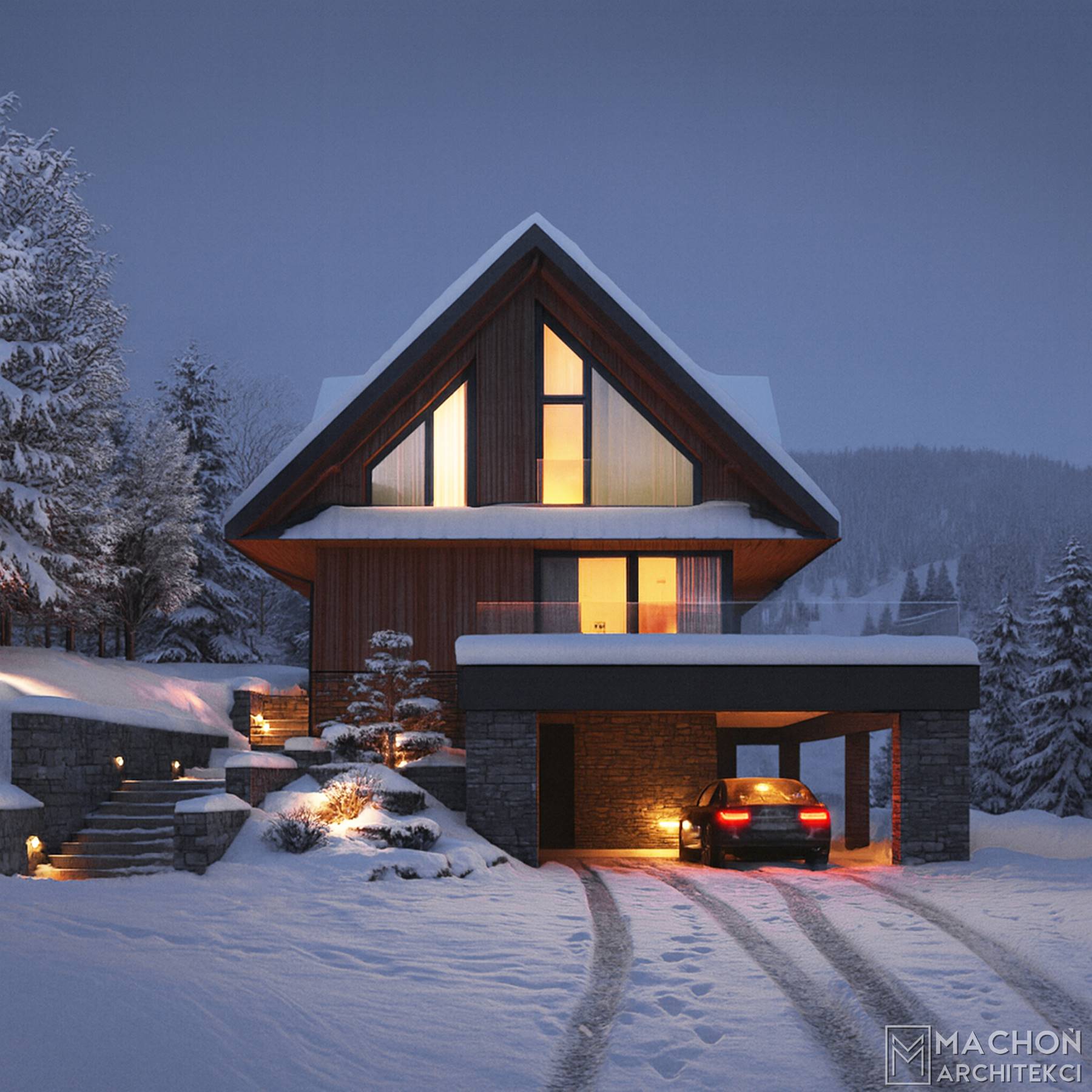 Projekt indywidualny budynku mieszkalnego jednorodzinnego w Szczyrku. Dom zaprojektowano na działce o znacznym spadku terenu, aby wykorzystać te ograniczenia zaprojektowano piwnicę która z jednej strony jest całkowicie zakopana w ziemi a przeciwległej strony całkowicie odkryta z podłużnym zadaszonym tarasem.