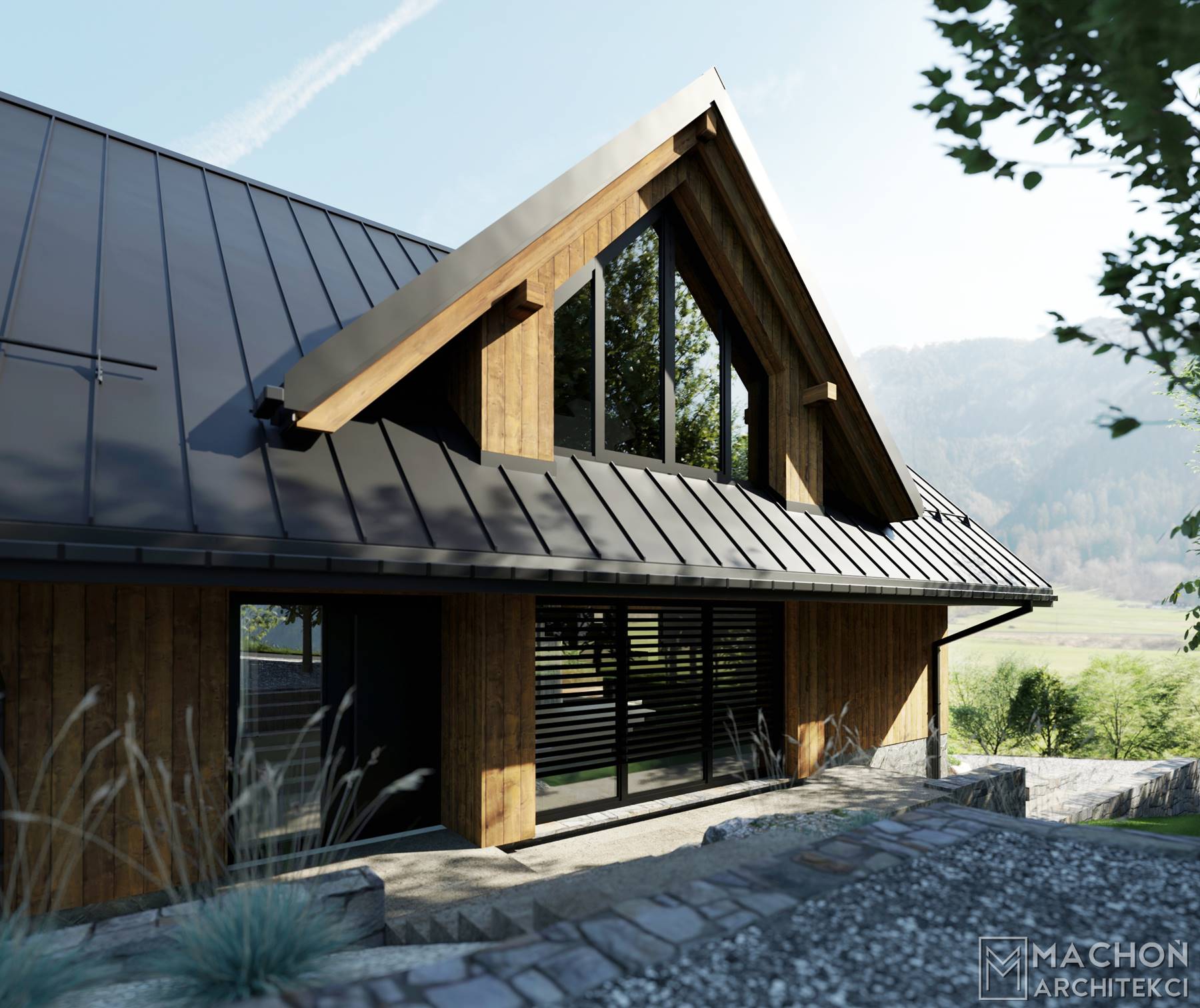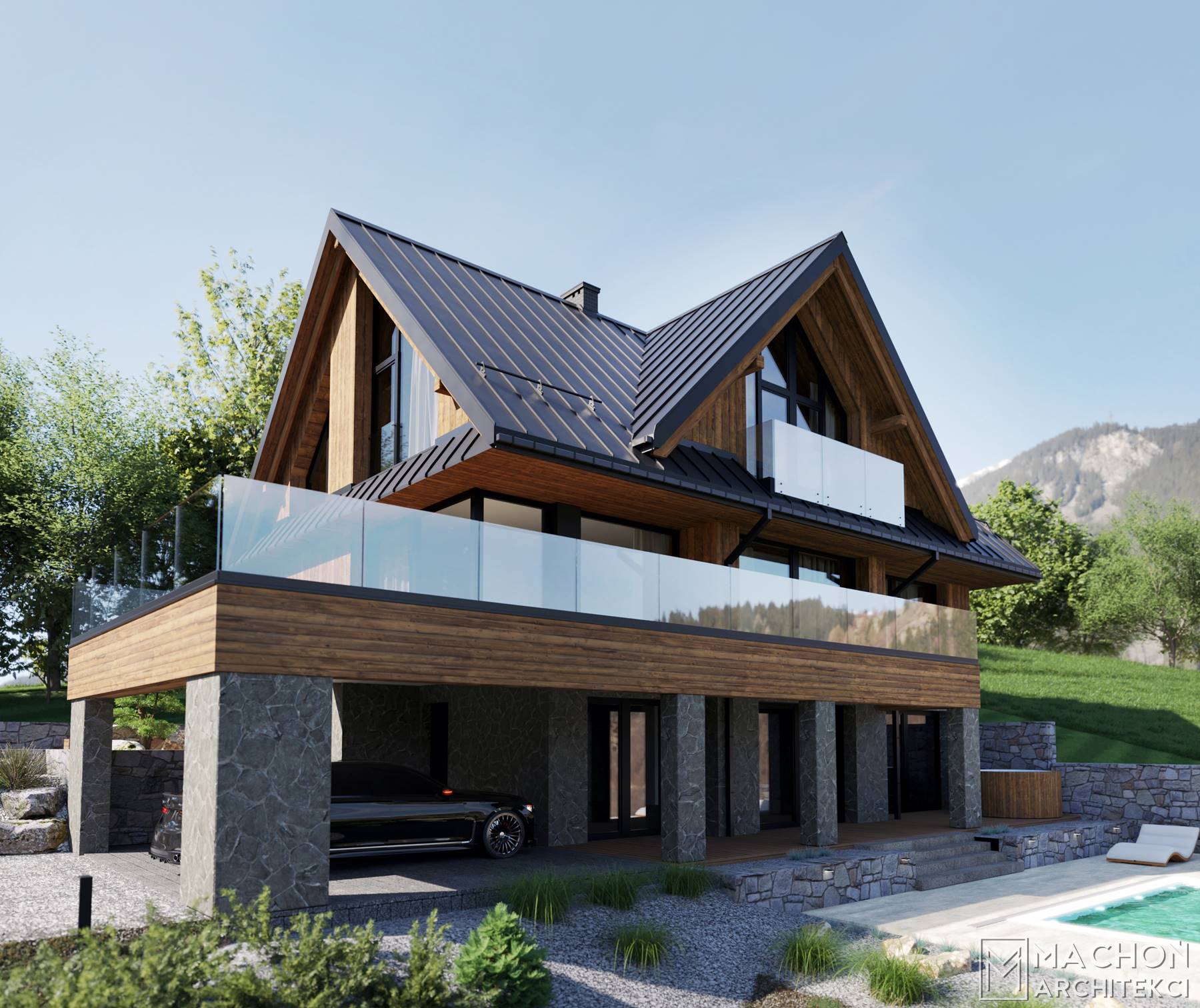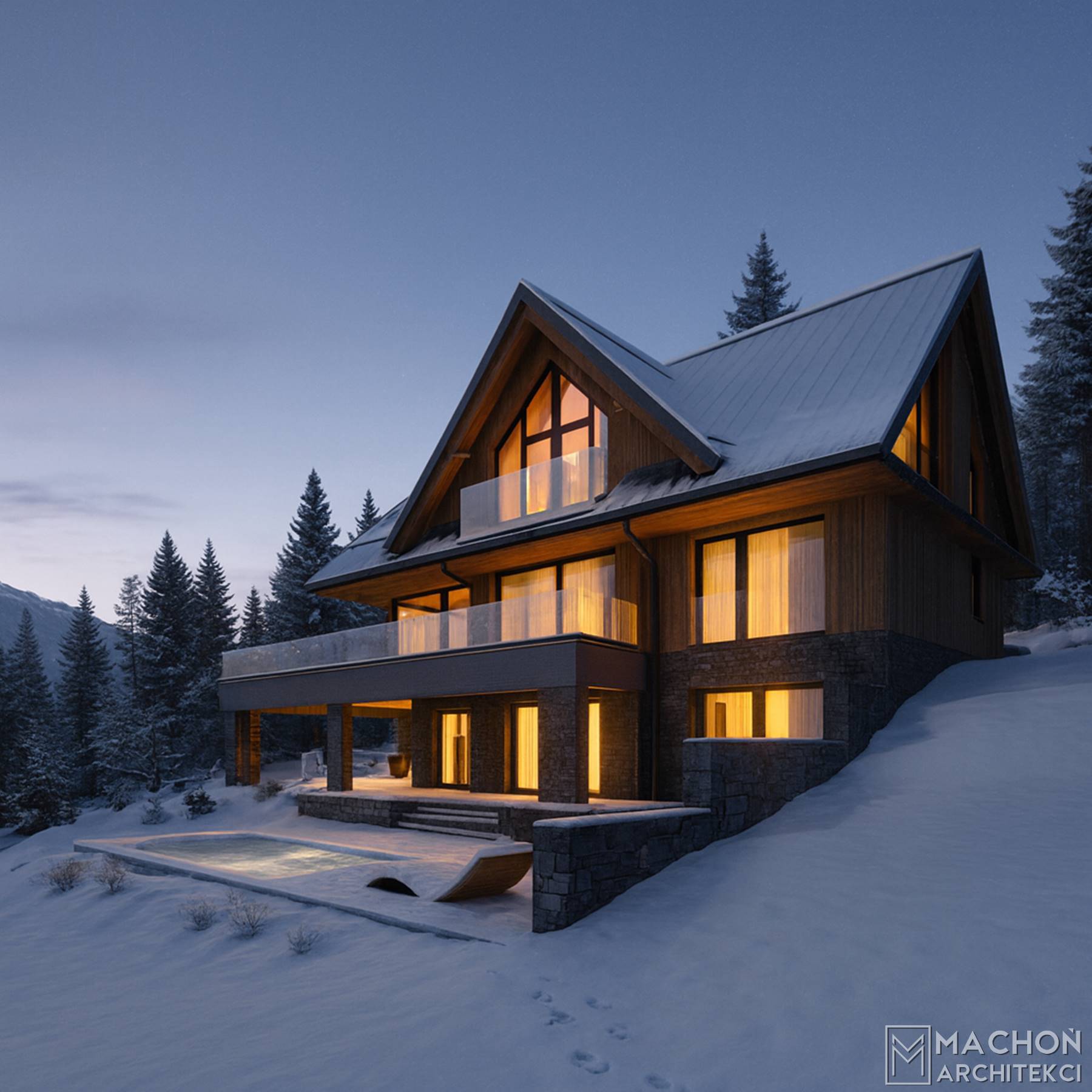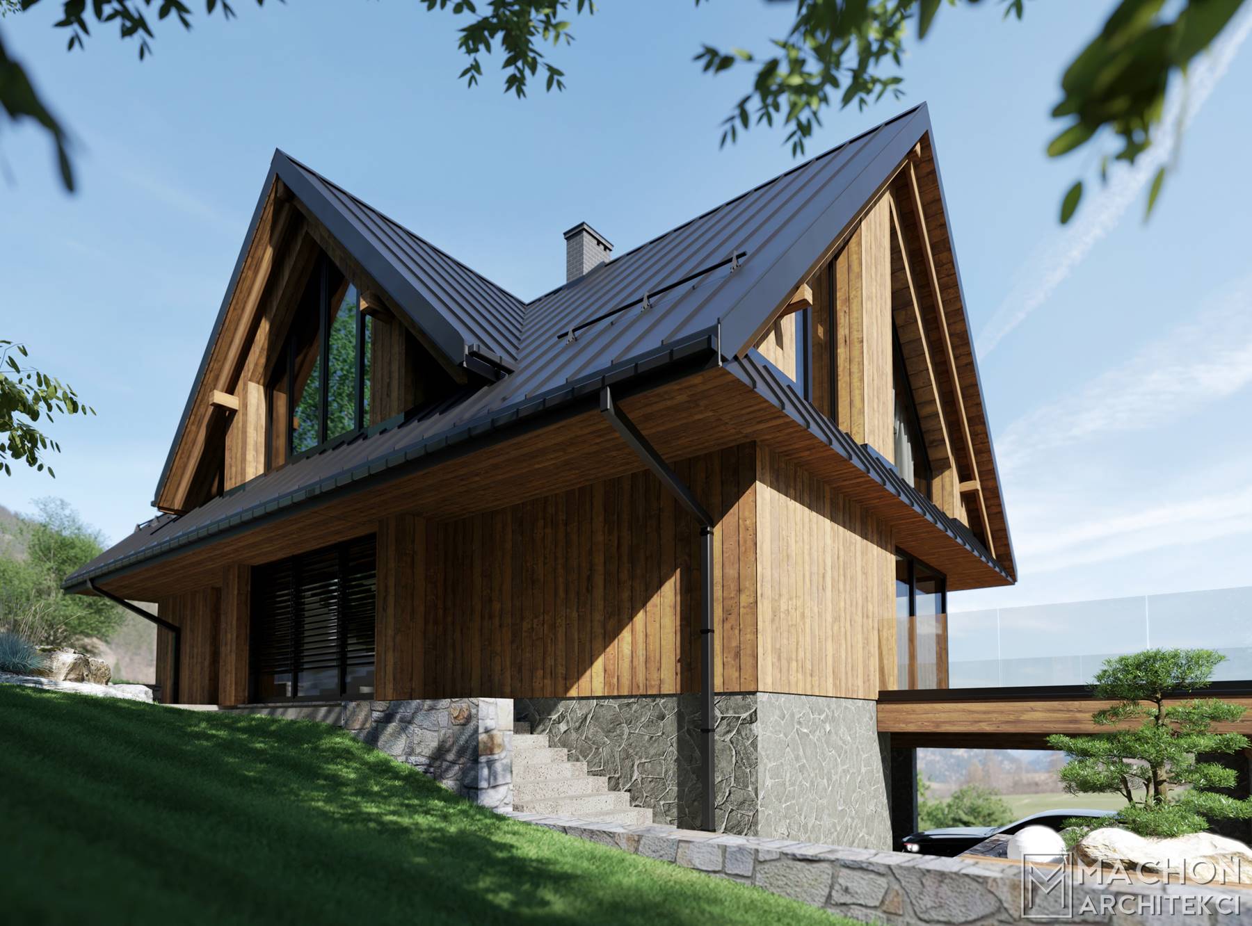 Projekt indywidualny budynku mieszkalnego jednorodzinnego w Szczyrku. Dom zaprojektowano na działce o znacznym spadku terenu, aby wykorzystać te ograniczenia zaprojektowano piwnicę która z jednej strony jest całkowicie zakopana w ziemi a przeciwległej strony całkowicie odkryta z podłużnym zadaszonym tarasem.