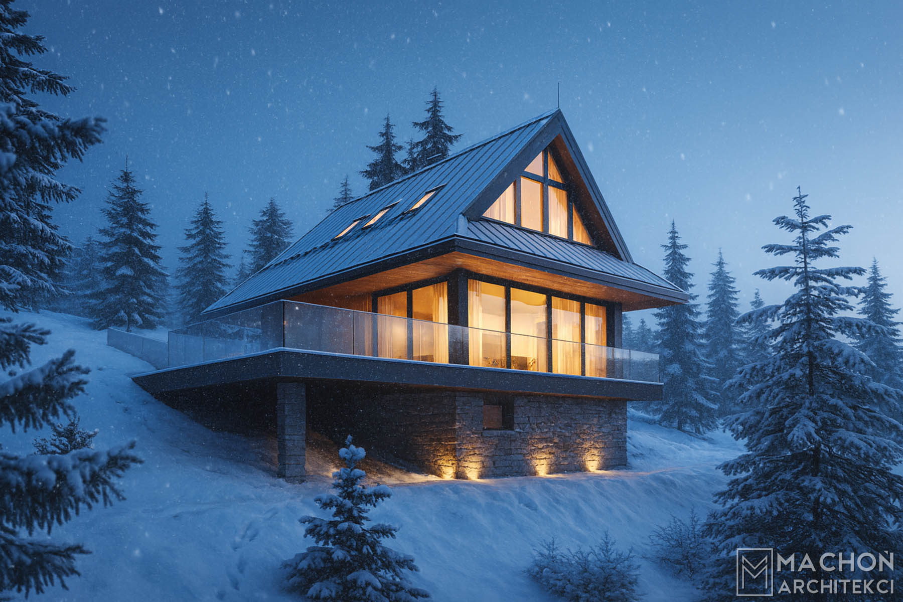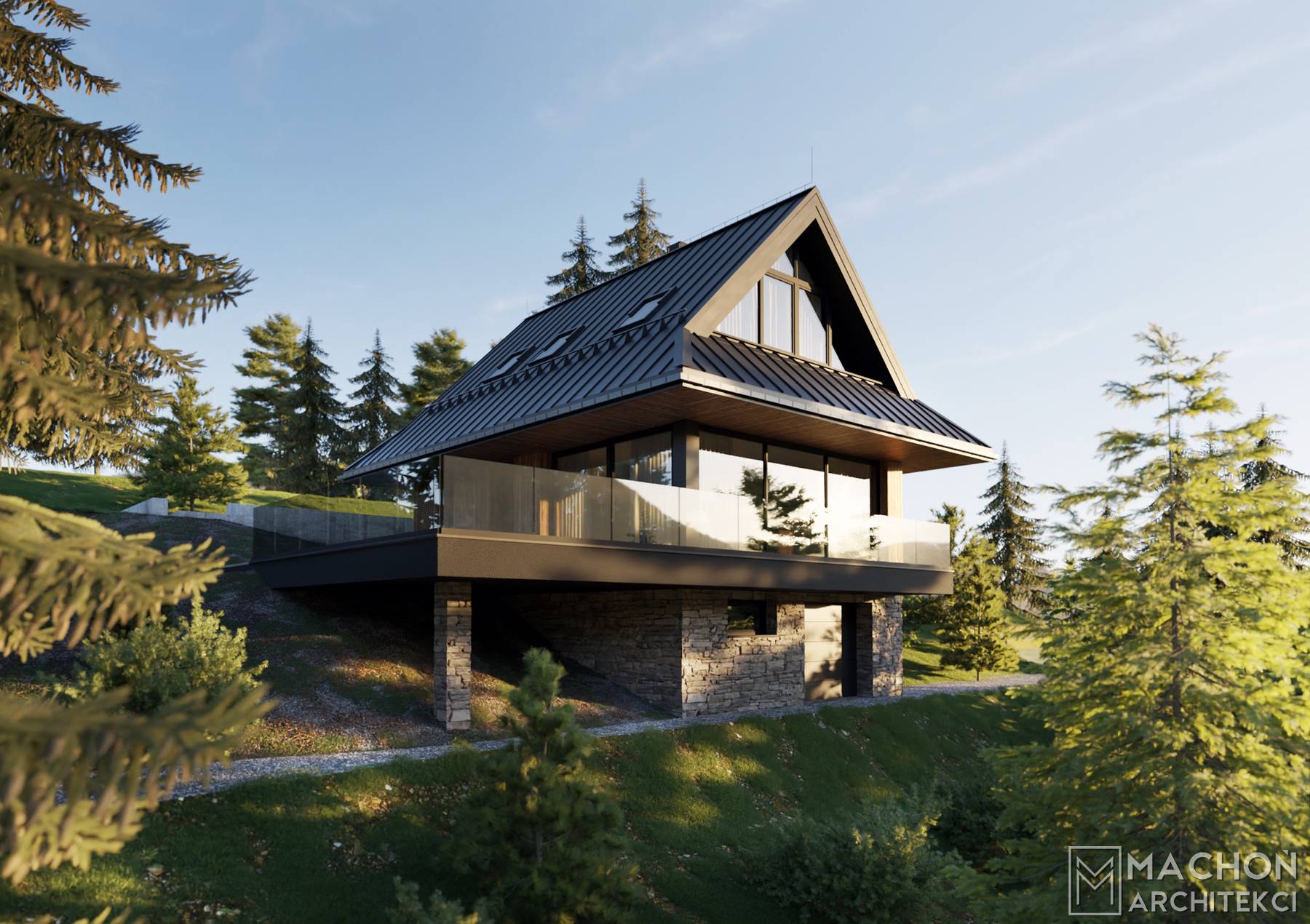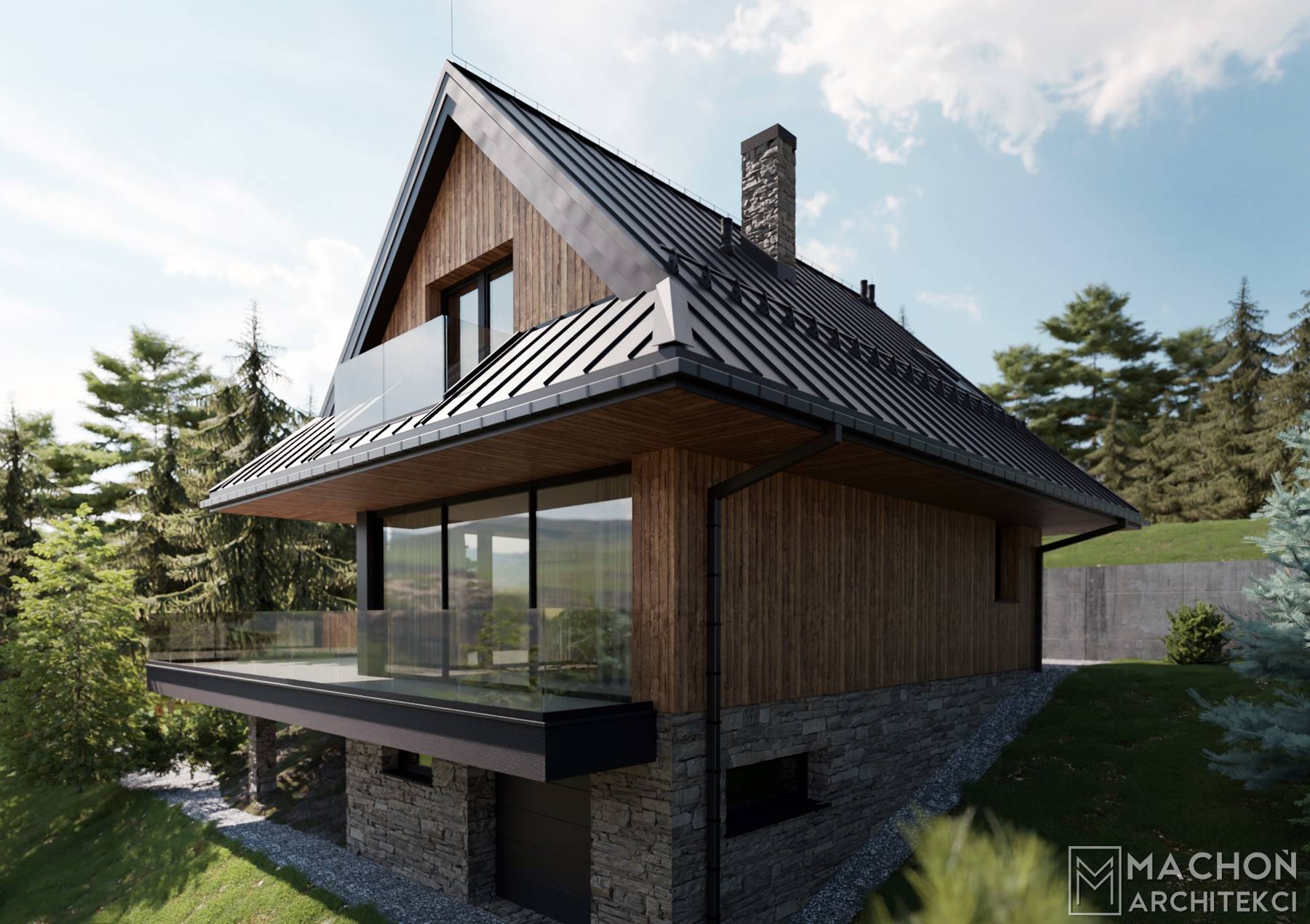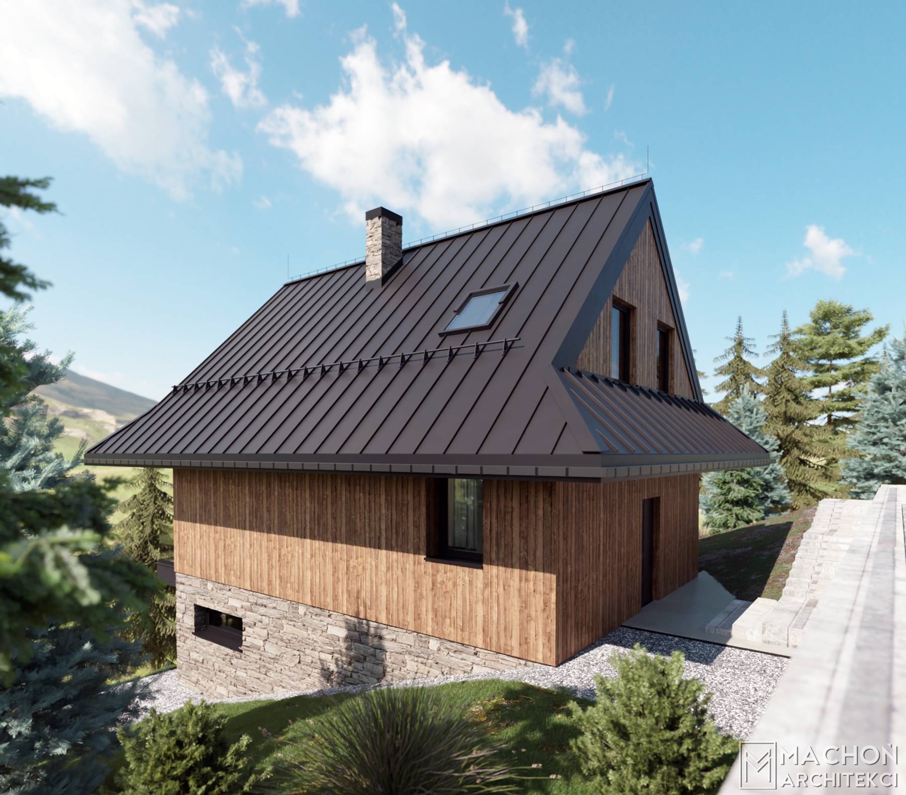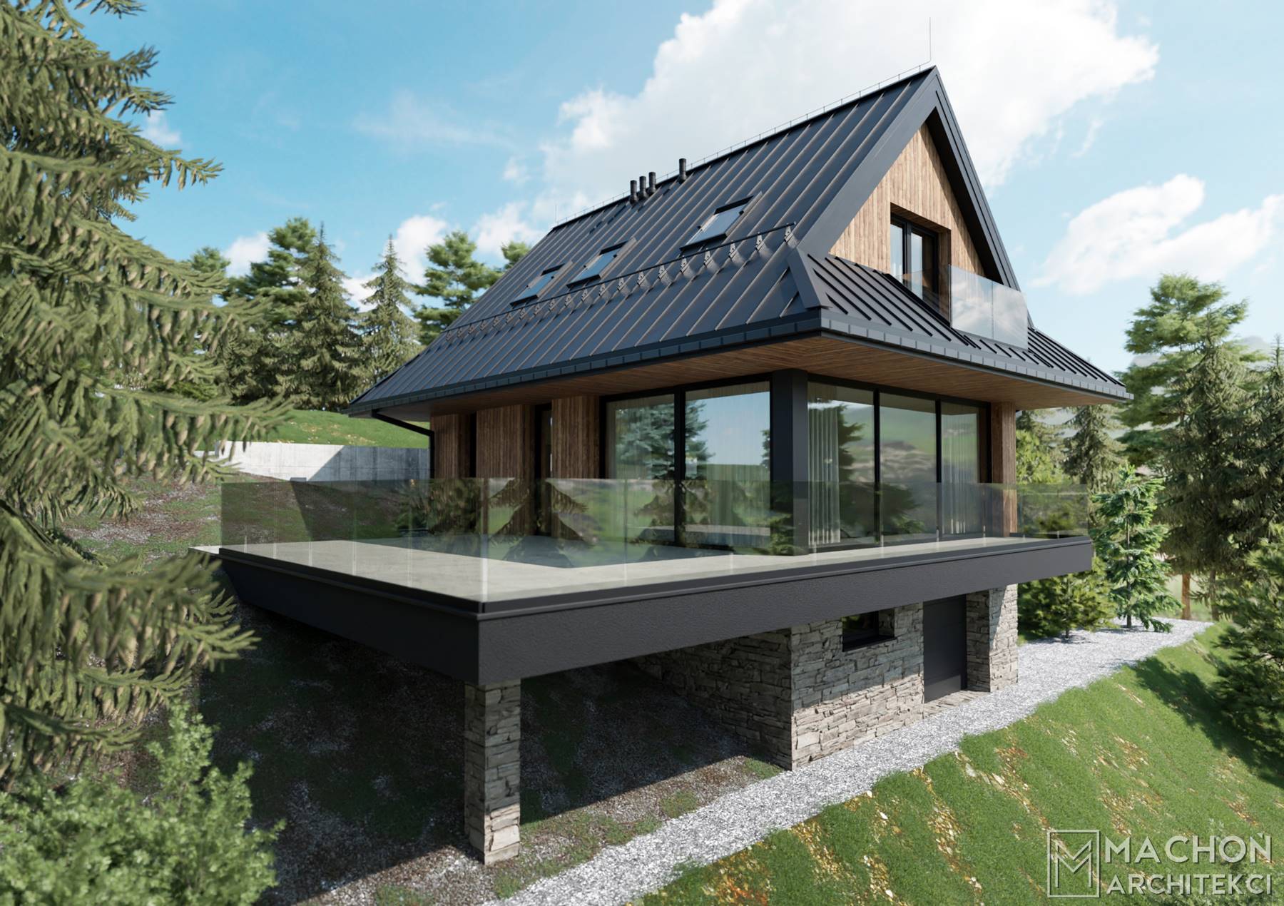 indywidualny projekt nowoczesnego domu w którym zastosowano tradycyjną podhalańską formę dachu. Budynek powstanie na terenie z dużym spadkiem, na pięknej działce z widokiem na Babią Górę. Obiekt posiada całkiem spory taras nadziemny. Na etapie sporządzania projektu koncepcyjnego zaproponowano dwa rozwiązania projektowe dotyczące okna sypialni na poddaszu w jednej z nich zastosowano duże okno w formie trójkąta w innym wariancie jest to okno o prostokątnym kształcie wraz z balkonem.