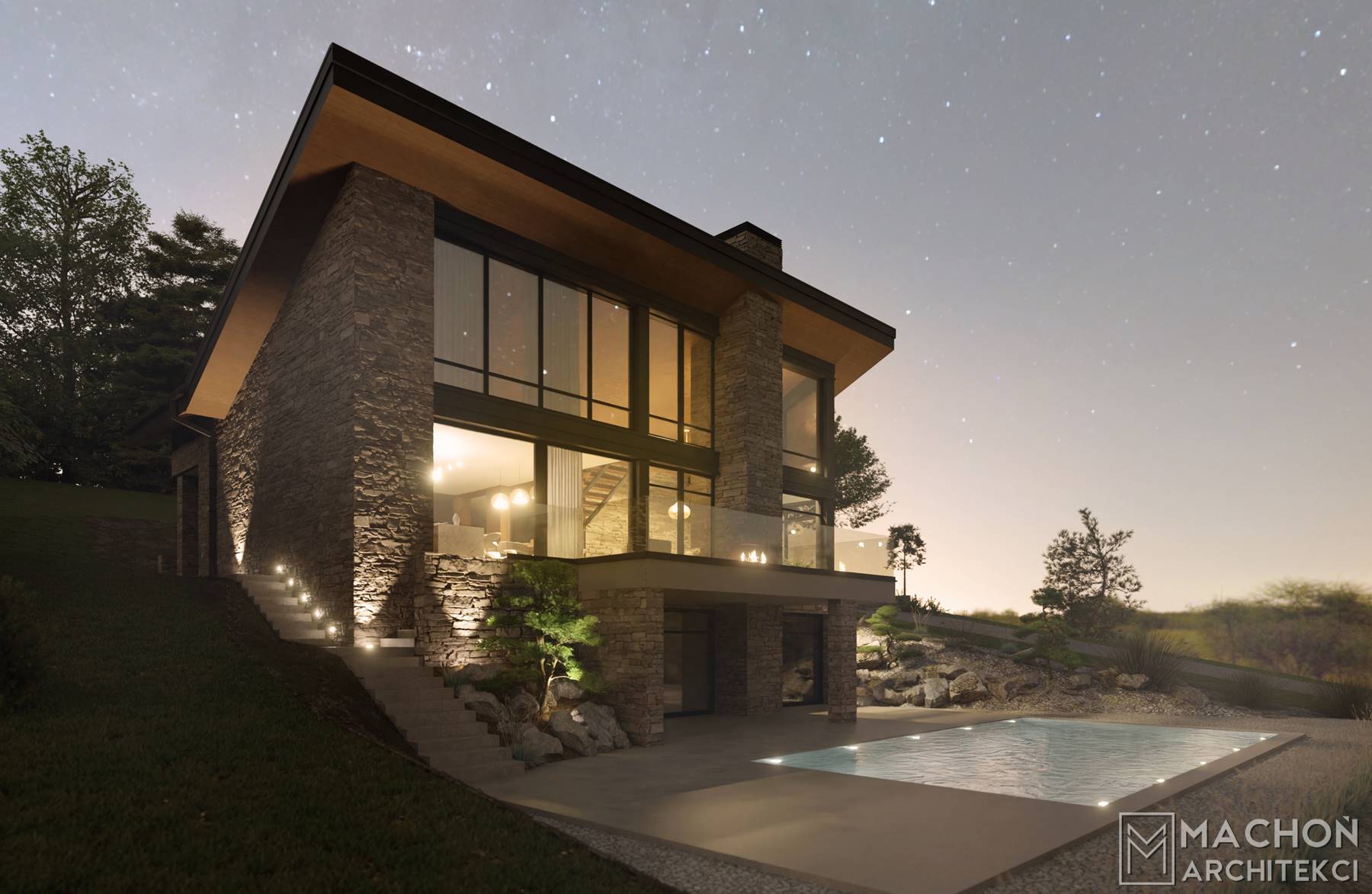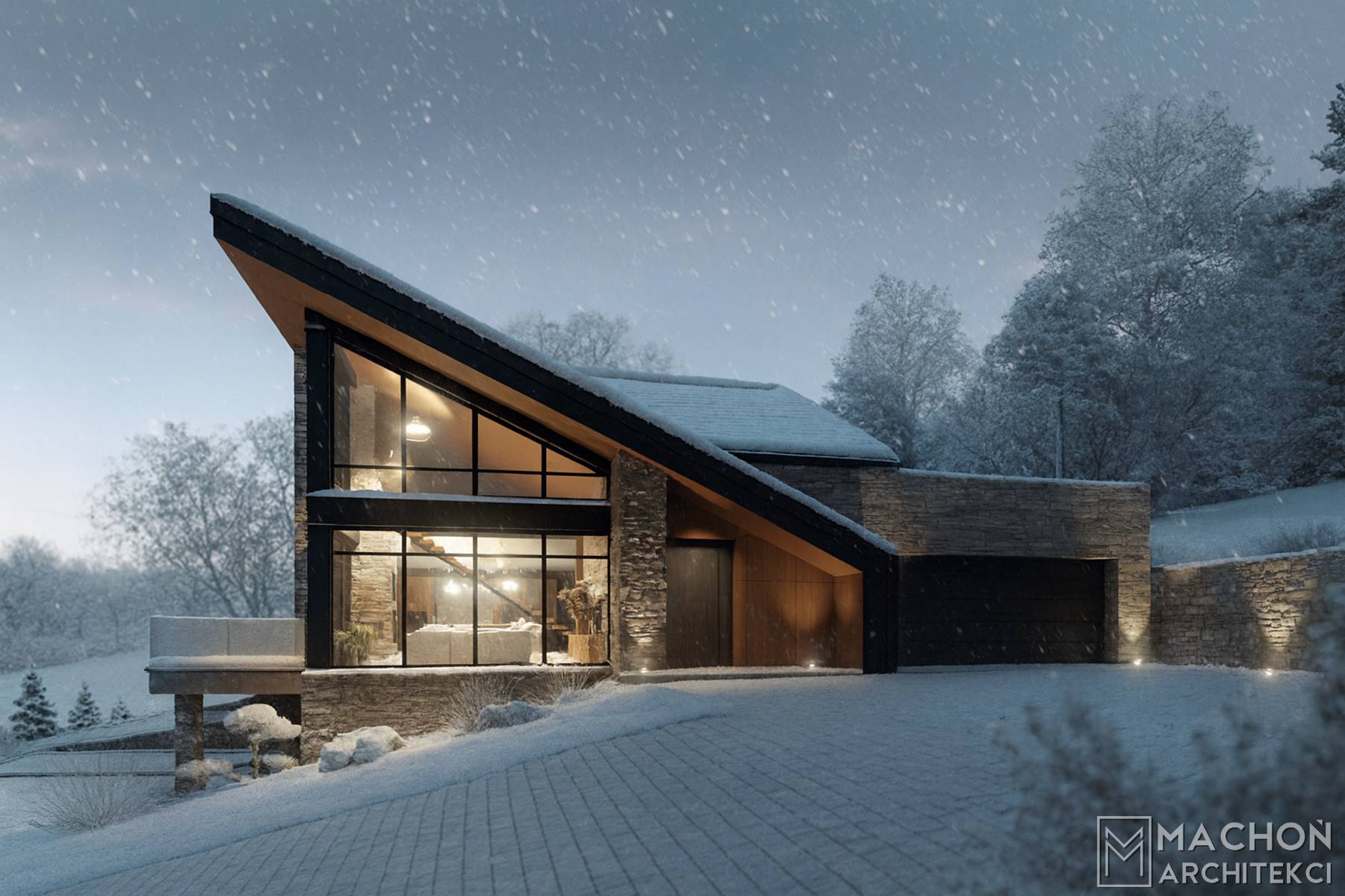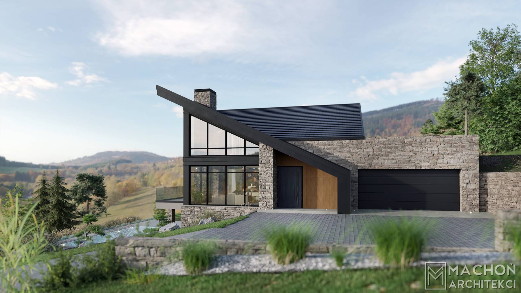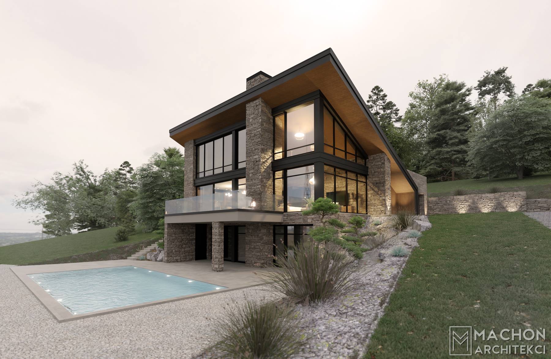 Projekt indywidualny budynku mieszkalnego jednorodzinnego w Ustroniu. Został zaprojektowany na pochyłej działce pod lasem. Obiekt posiada dwa tarasy od strony odstokowej , jeden naziemny z basenem drugi nadziemny dostępny z salonu. W piwnicy znajduje się strefa relaksu z wyjściem na ogród. W bryle domu znajduje się również garaż dwustanowiskowy.