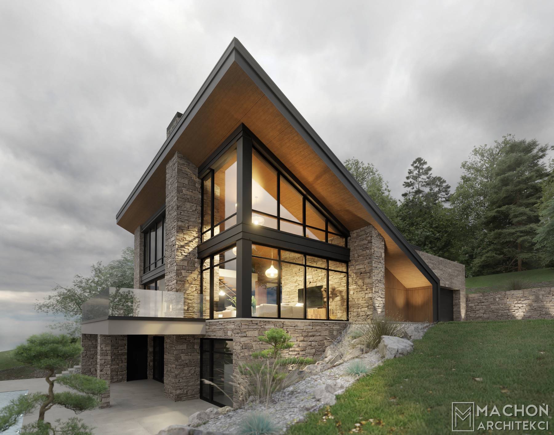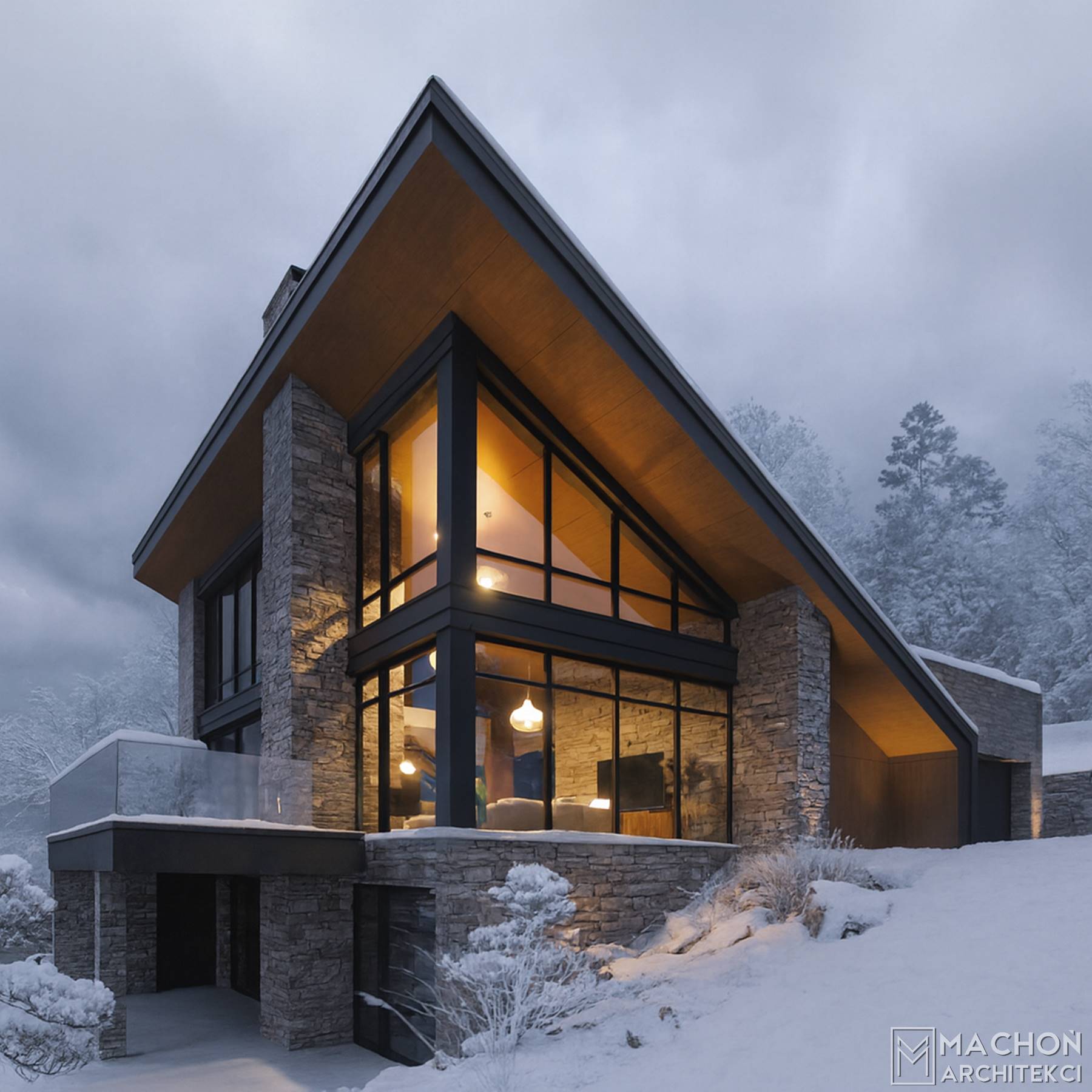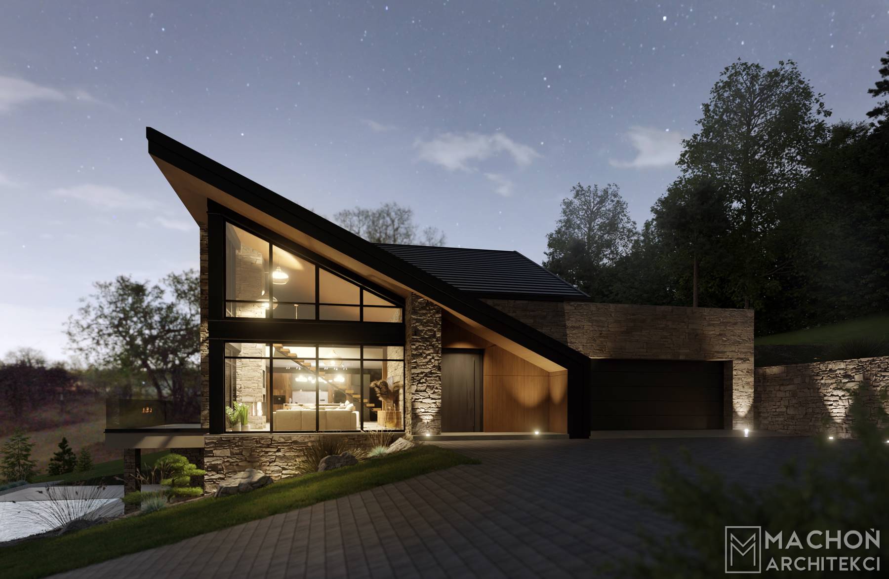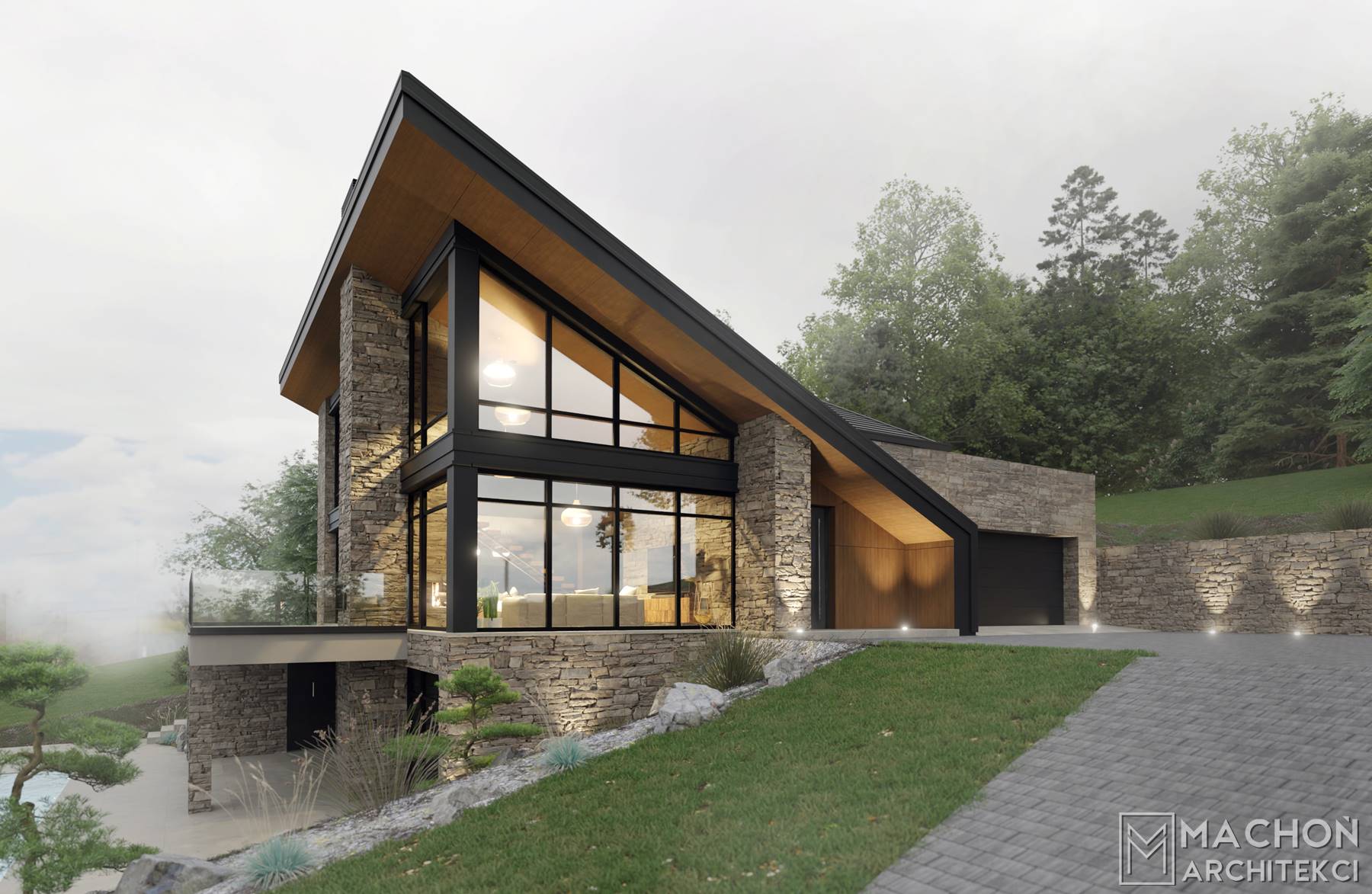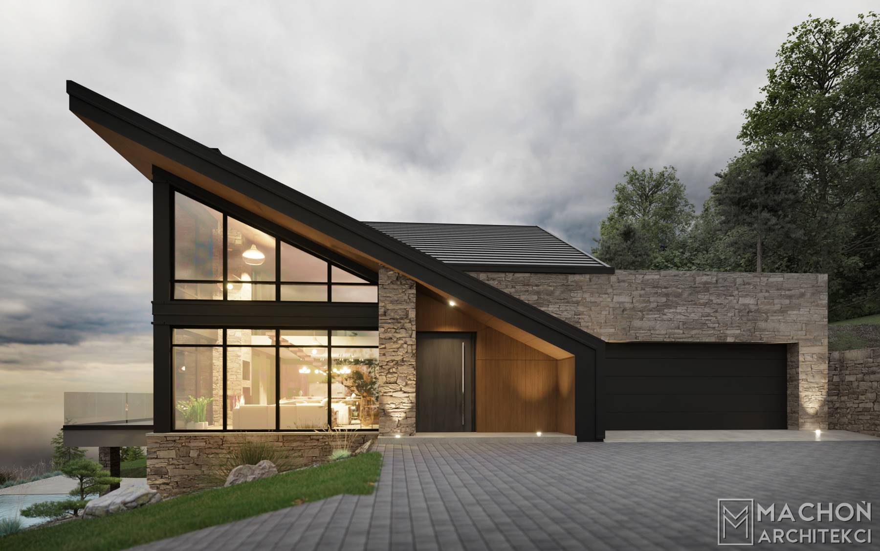 Projekt indywidualny budynku mieszkalnego jednorodzinnego w Ustroniu. Został zaprojektowany na pochyłej działce pod lasem. Obiekt posiada dwa tarasy od strony odstokowej , jeden naziemny z basenem drugi nadziemny dostępny z salonu. W piwnicy znajduje się strefa relaksu z wyjściem na ogród. W bryle domu znajduje się również garaż dwustanowiskowy.